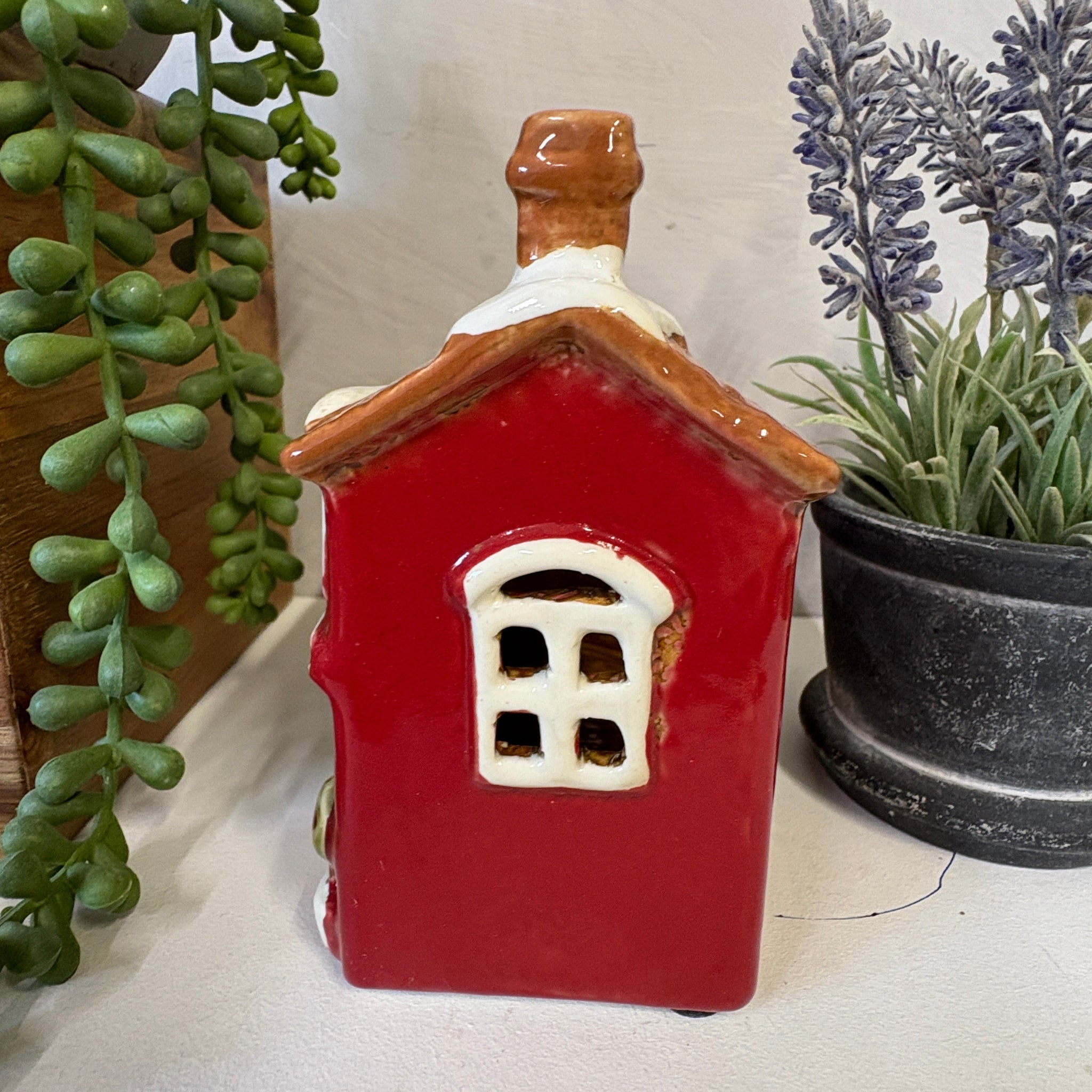 Village Pottery Ceramic Christmas Toy Shop Tea Light  Holder with a gap in back to insert a tea light . The glow from the tea light adds a lovely ambience to any room . Im happy to gift wrap and add a candle for a special gift .